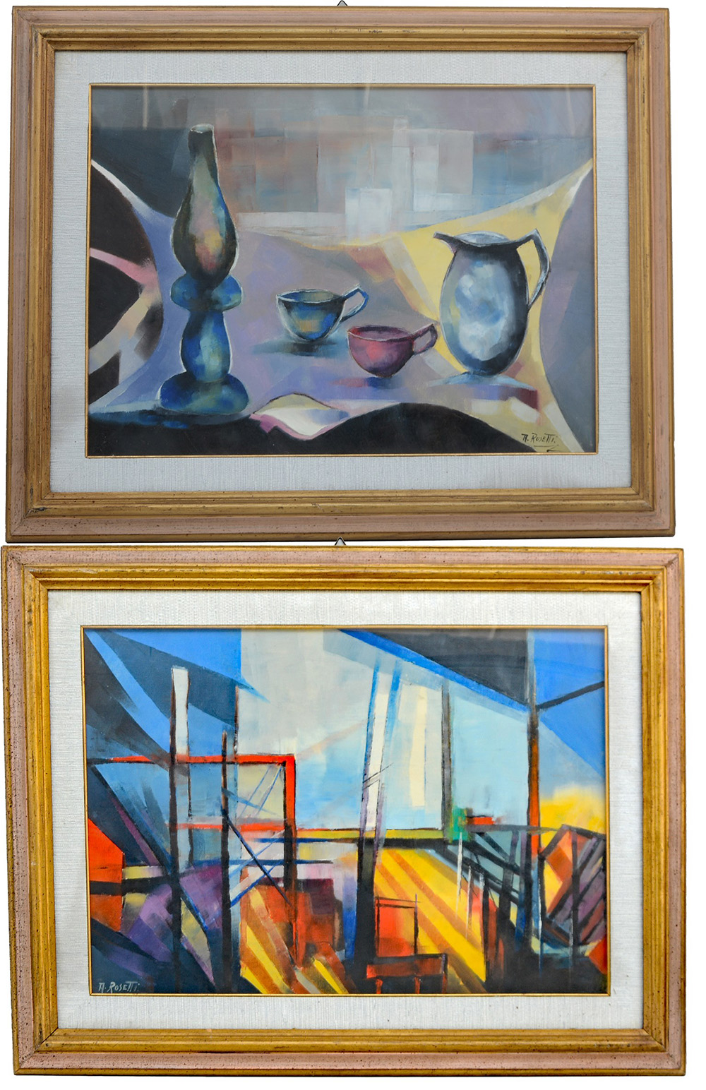Antonio Rosetti "Natura morta con lanterna" e " Interno", lotto di due olii su tela (cm 50x70) firmati in basso, in cornici