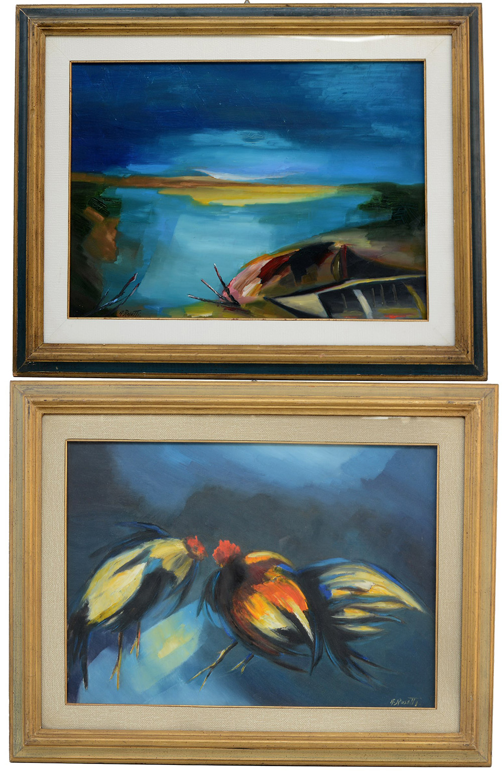 Antonio Rosetti "Galli" e " Paesaggio lacustre", lotto di due olii su tela (cm 50x70) firmati in basso, in cornici