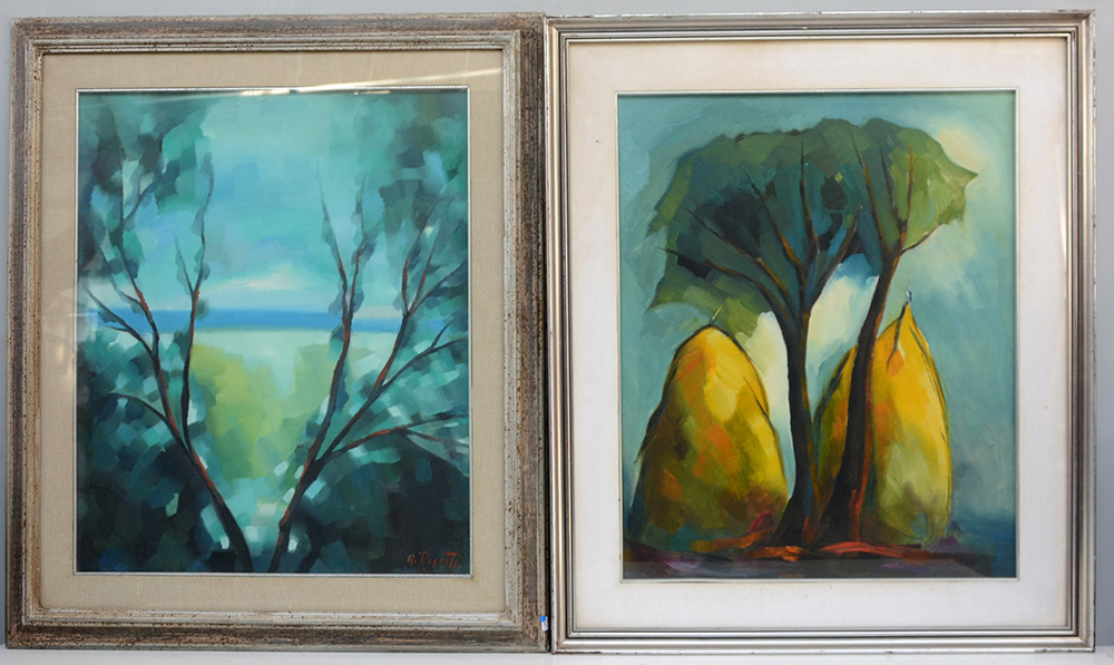 Antonio Rosetti Lotto di due olii su tela raffiguranti paesaggio lacustre e alberi con pagliai (cm 60x50) firmati, in cornici