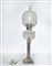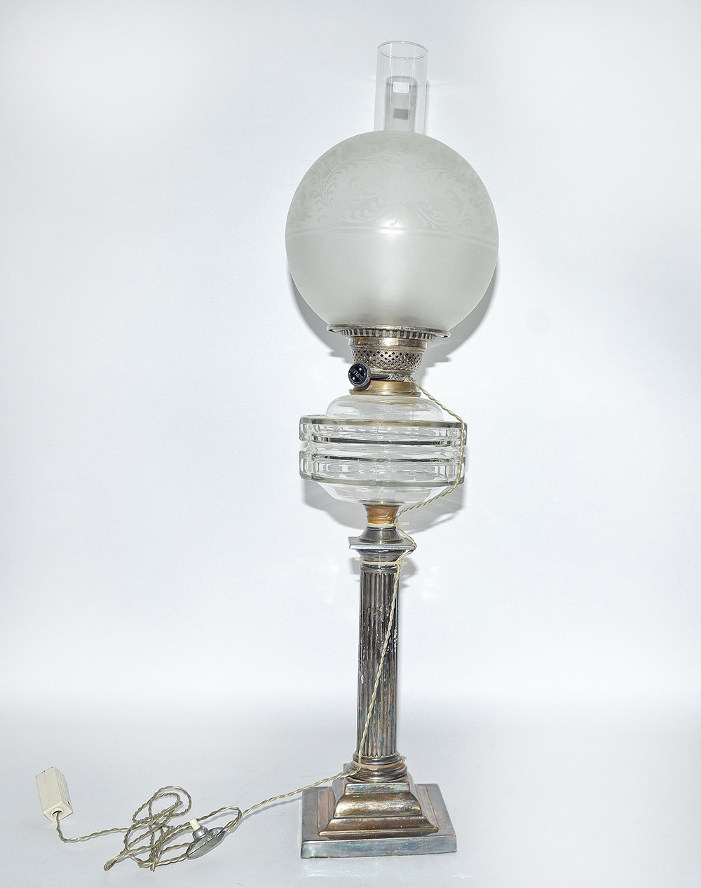 Lampada ad olio con fusto a forma di colonna scanalata in metallo argentato, paralume in vetro (h cm 75)(difetti)