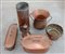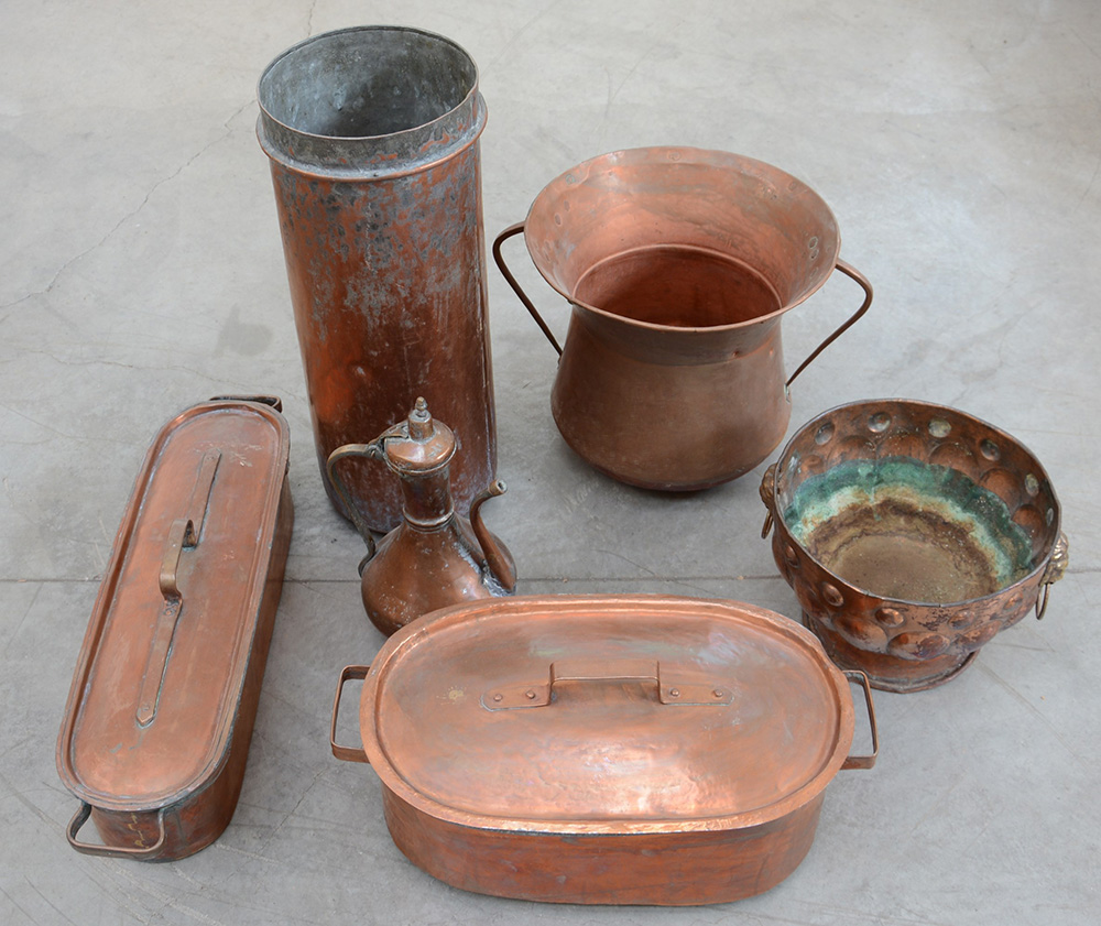 Lotto composto da due contenitori con coperchio, due contenitori biansati, un contenitore a cilindro e una cuccuma in rame (difetti)