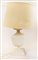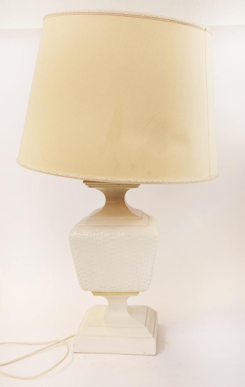 Lampada da tavolo a tre luci con corpo in ceramica bianca su piede a plinto, completa di paralume (h tot cm 85) (difetti)