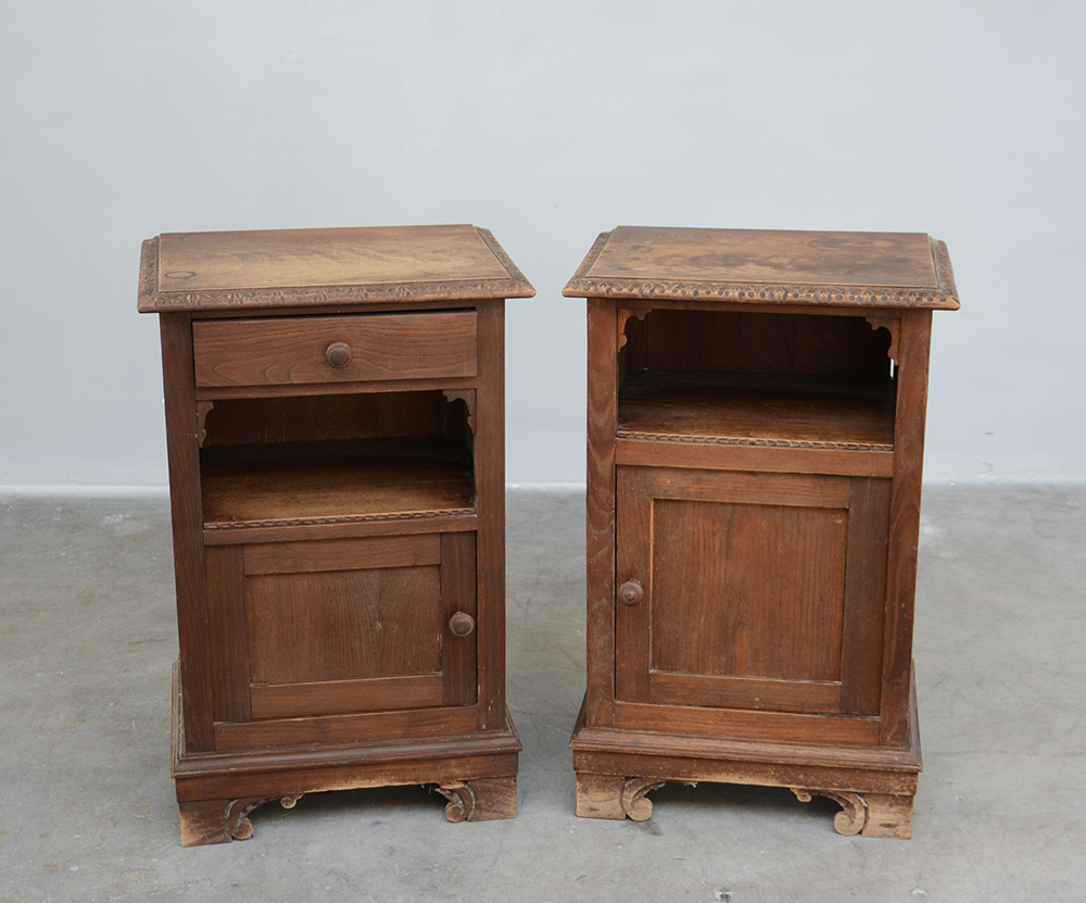 Coppia di comodini ad un'anta e un cassetto, piedi a mensola (cm 50x80x40) (difetti)