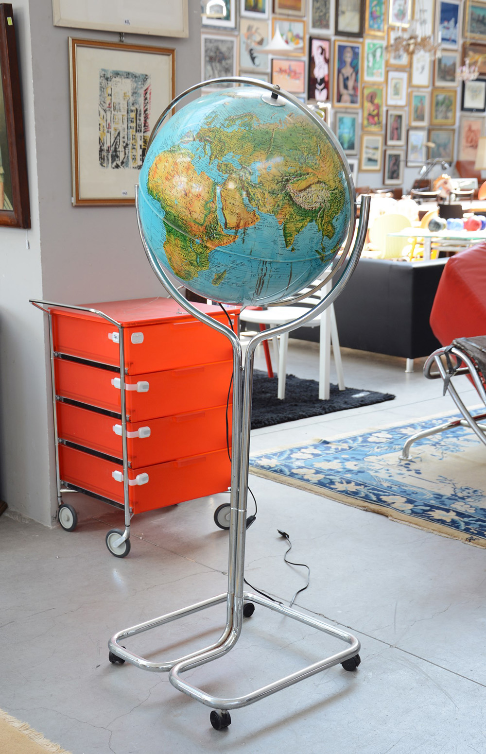 Mappamondo edizione Ricoscope Firenze, su base in metallo cromato (h. cm 150) (difetti)
