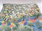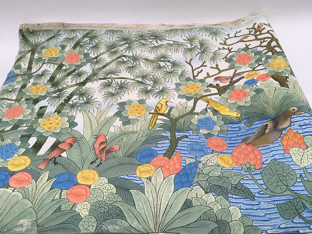 Pannello decorativo su tela raffigurante un paesaggio con uccelli, bambù e fiori (cm 80x180) (difetti)