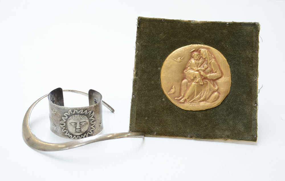 TILLIO NANNI "Madonna con Bambino" bassorilievo in oro, g. 21,50 unito a un bracciale in argento e un collier in argento