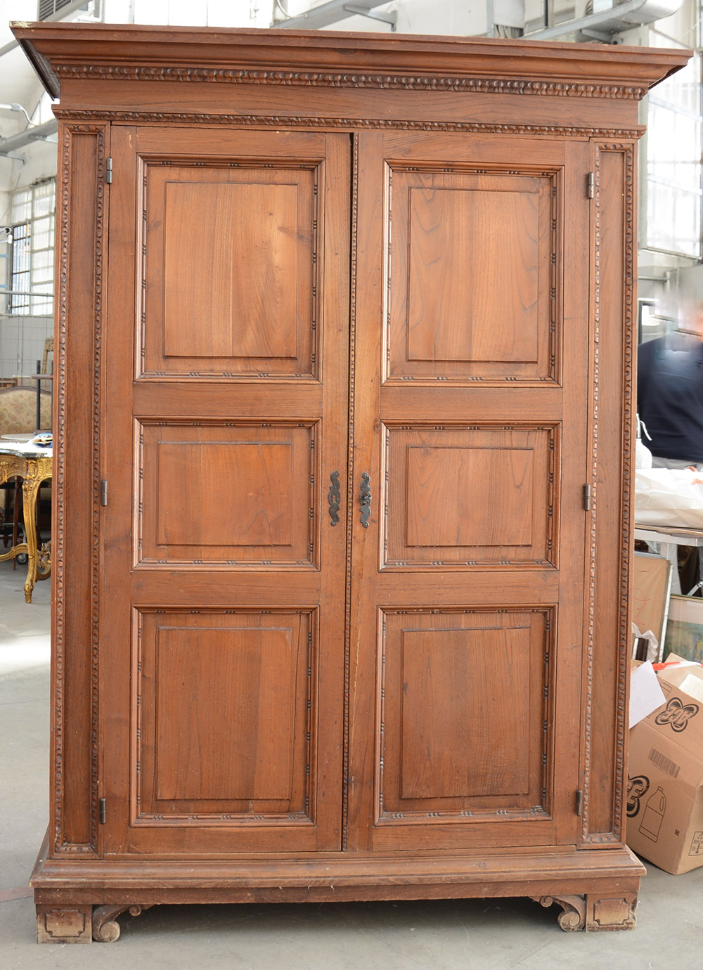 Armadio a due ante pannellate con fascia e montanti intagliati a motivi concatenati. Piedi a mensola (cm 150x200x700) (difetti)