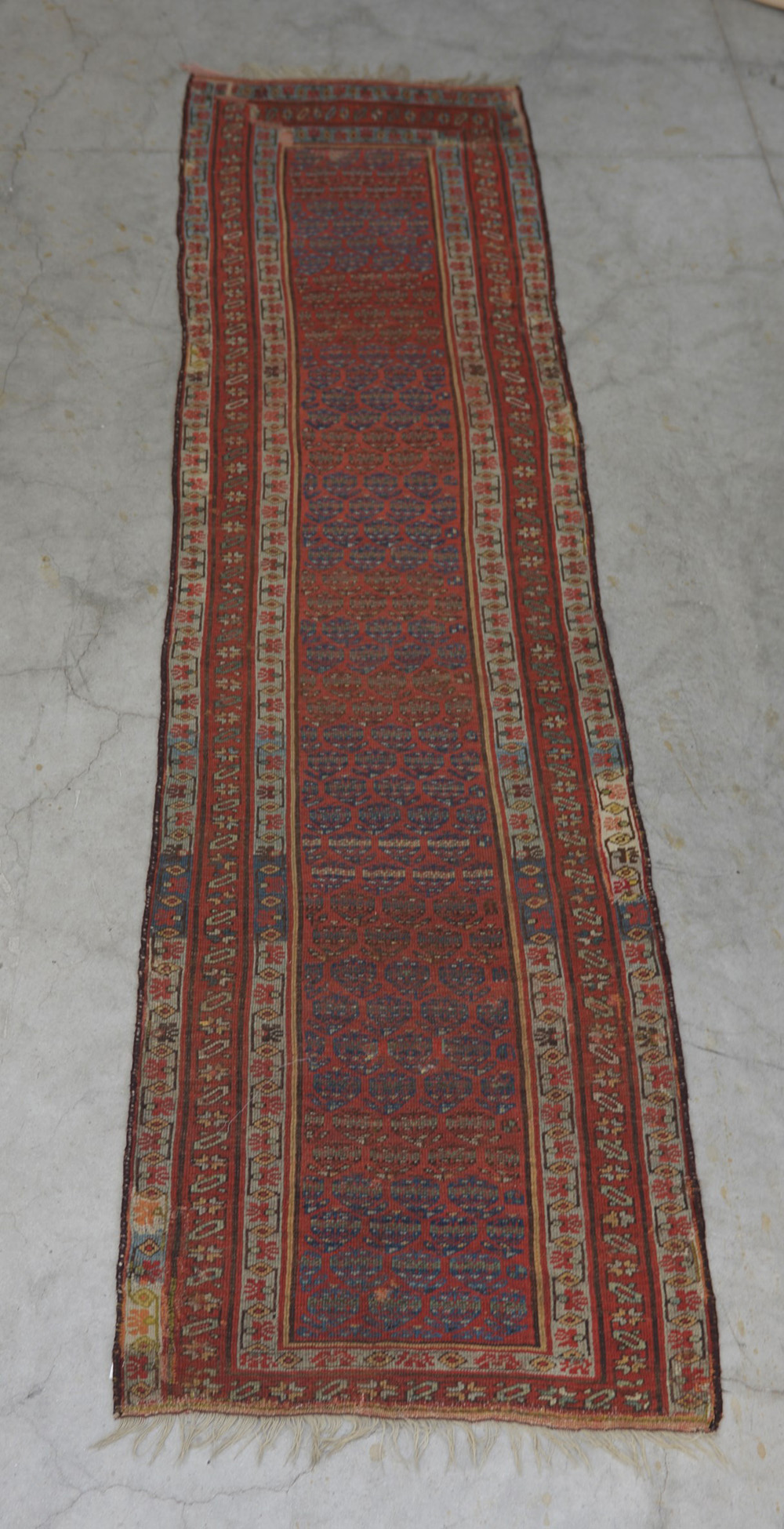 [Tappeti] Tappeto passatoia Gandje, Caucaso, inizio sec. XX. Disegno con file di Boteh azzurro e blu su campo rosso (362x97)(gravi difetti)
