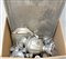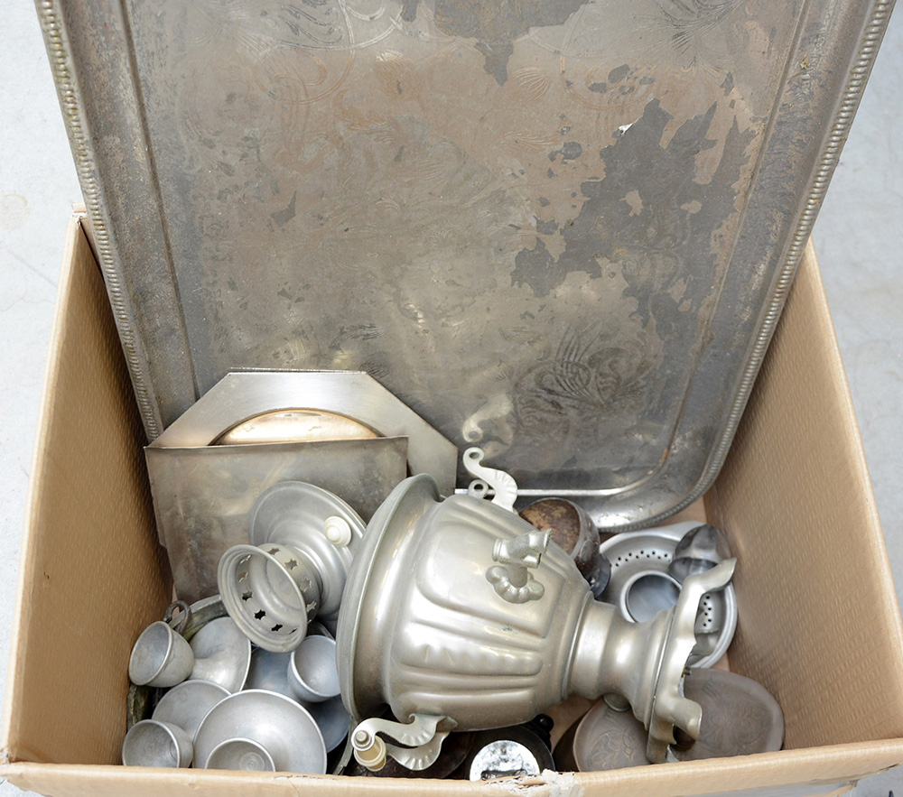 Cartone contenente numerosi oggetti per la tavola in metallo (difetti)