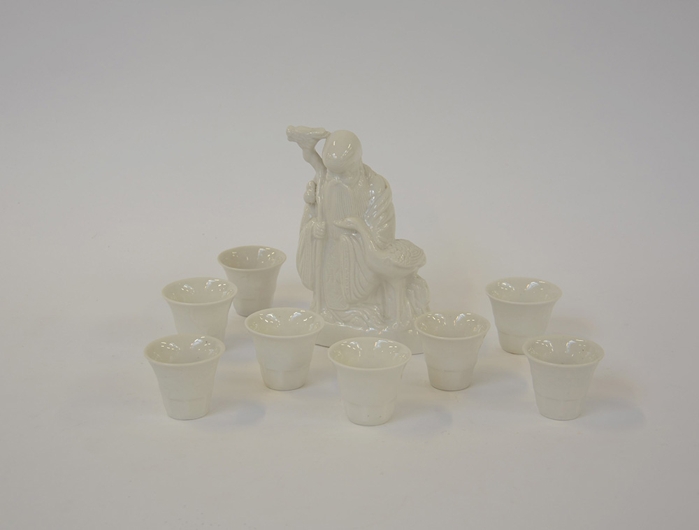 Arte orientale. Lotto composto da una sculturina raffigurante Santone e otto ciotoline in porcellana bianca (difetti)