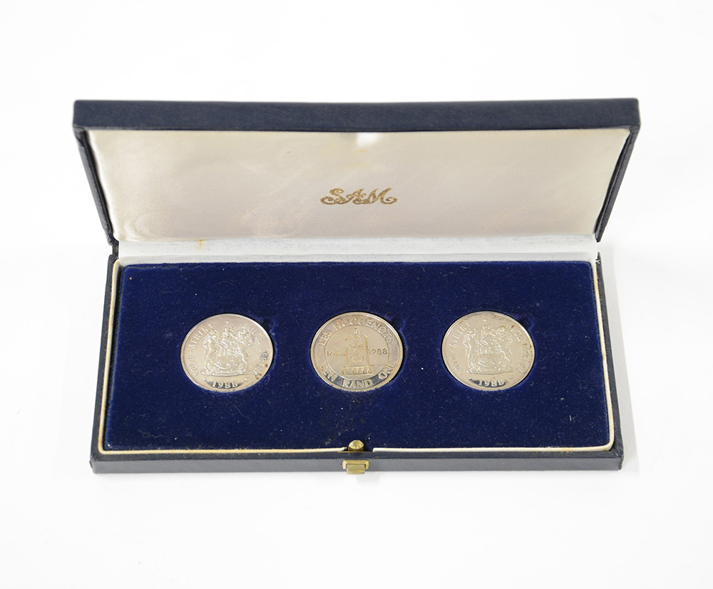 Gruppo di tre monete in argento da un Rand Sudafrica in custodia