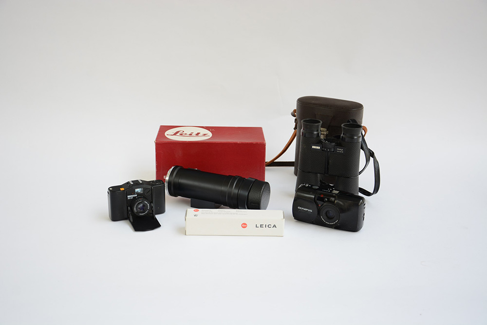 Lotto composto da un cavalletto Leica, un'ottica Leitz, un binocolo Zeiss in custodia e due macchine fotografiche Olympus e Minox (difetti)