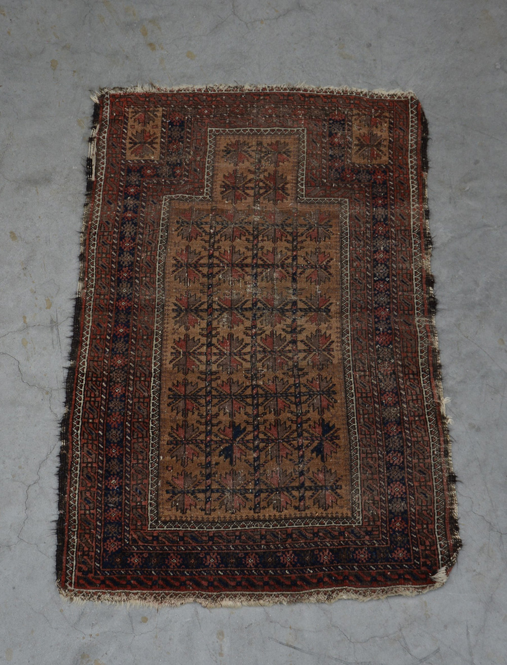 [Tappeti] Tappeto Beluchistan, Persia, inizio sec. XX. Disegno a preghiera nei toni del beige, marrone e blu (cm 141x87)(difetti e mancanze)