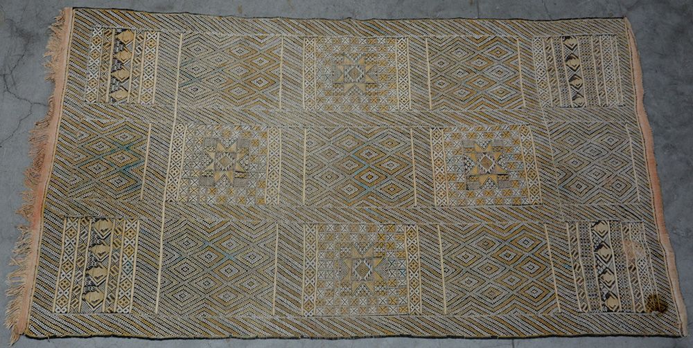 [Tappeti] Stuoia, Marocco, sec. XX. Disegno geometrico diviso in sezioni quadrate nei toni del beige, giallo, azzurro e nero (cm 230x130) (difetti e mancanze)