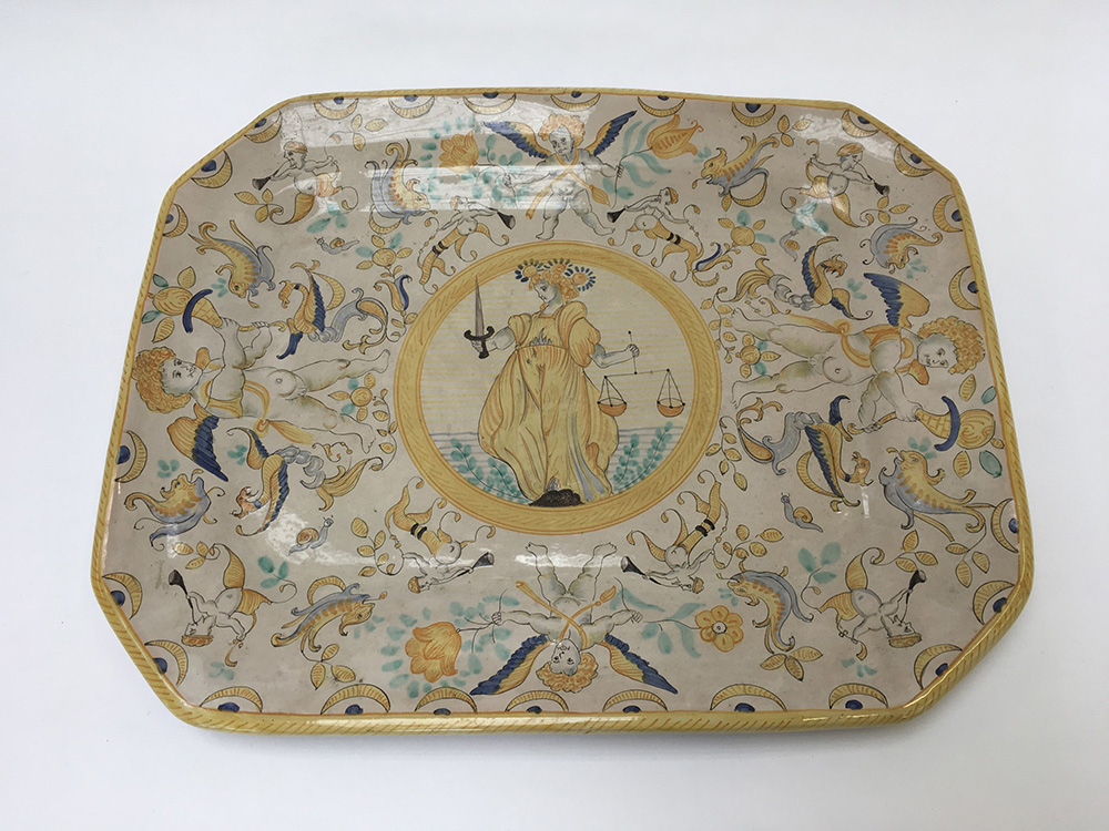 Manifattura di Deruta - Vassoio rettangolare ad angoli smussati decorato a raffaellesche, descrizioni al verso (cm 43x54) (lievi difetti)