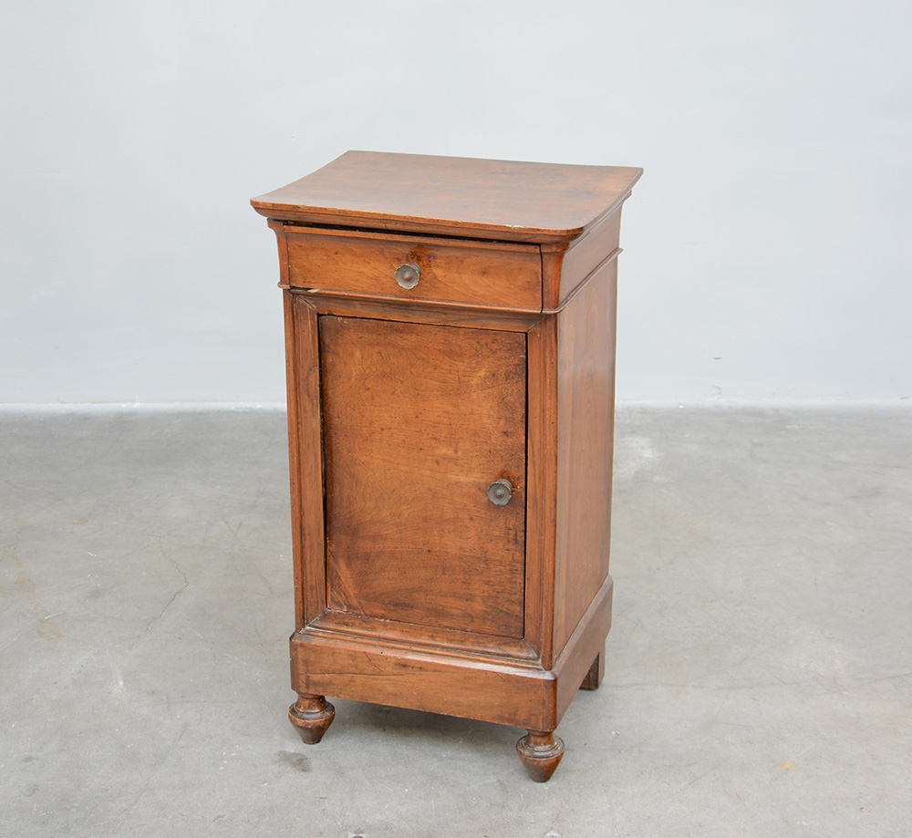 Comodino in noce ad un'anta e un cassetto con piedi torniti. Sec. XIX (cm 44x80x37) (difetti)
