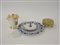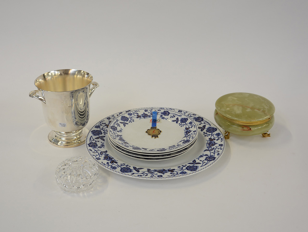 Lotto composto da cinque piatti, un secchiello e due scatole di materiali e...