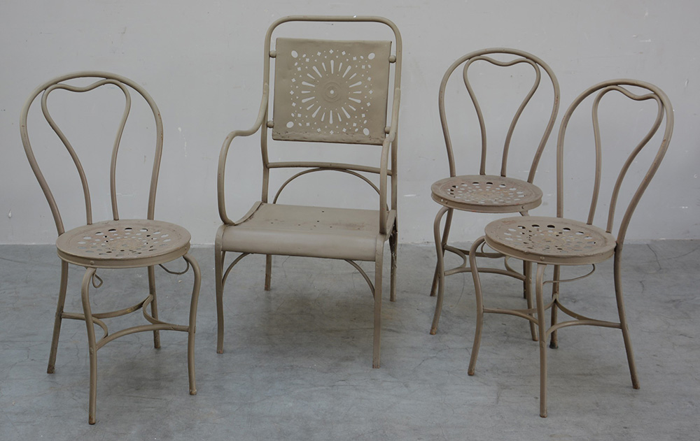 Lotto composto da una poltrona e tre sedie da giardino con struttura tubolare in metallo e sedute in lamiera di ferro, smaltate color tortora (difetti)