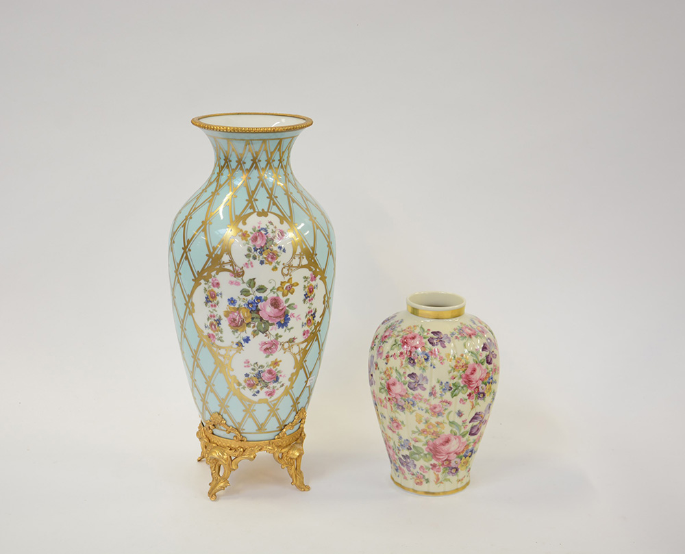 Lotto composto da due vasi in porcellana policroma, di cui uno con base in metallo