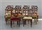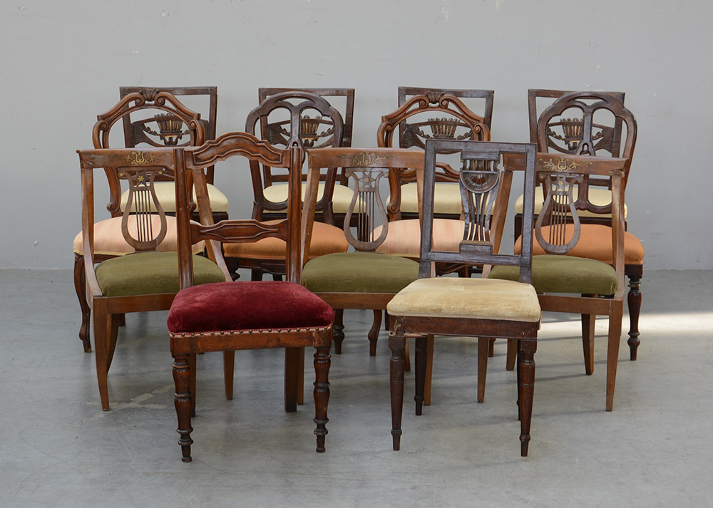 Lotto di tredici sedie di fatture e decori differenti, con schienali a giorno e sedute imbottite, sec. XIX (difetti e mancanze)