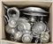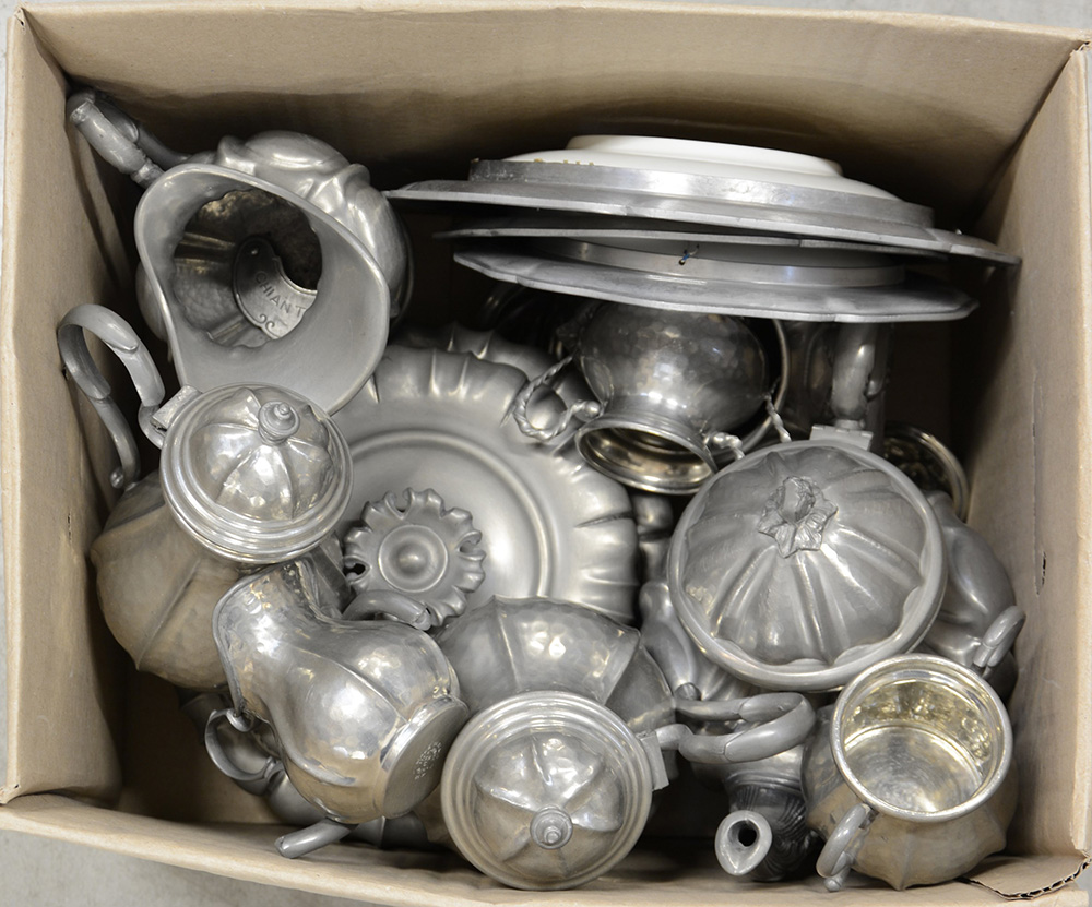 Cartone contenente numerosi oggetti in peltro (difetti)