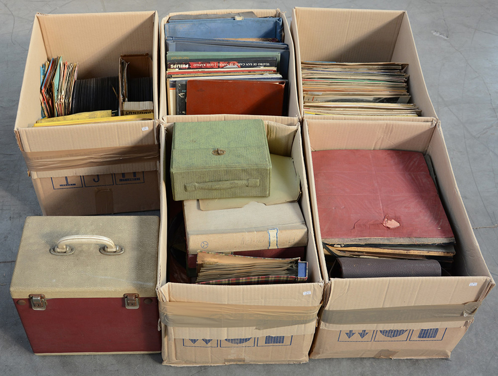 Lotto composto da cinque scatoloni ed un contenitore contenenti diversi dischi di vario genere 33 e 45 giri (difetti)