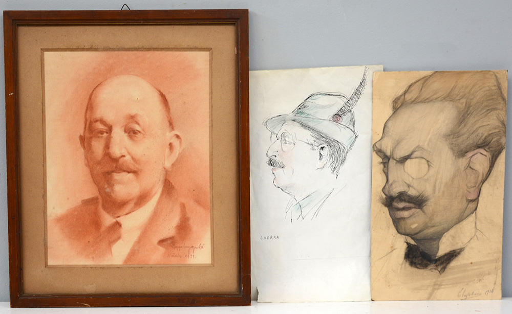Autori diversi. Gruppo di tre disegni dell'inizio del sec XX raffiguranti gentiluomini, firmati. Misure diverse, uno in cornice (difetti)