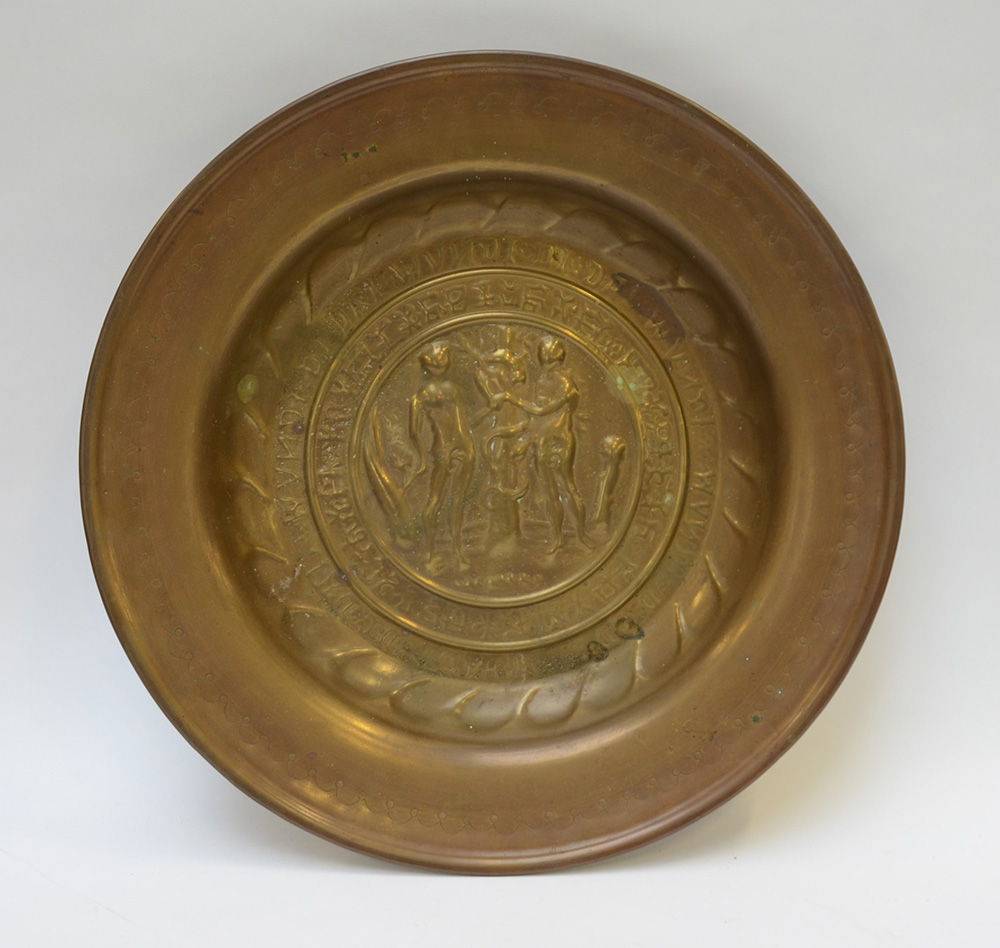 Elemosiniere in ottone decorato nel cavetto con Adamo ed Eva (d. cm 46)
