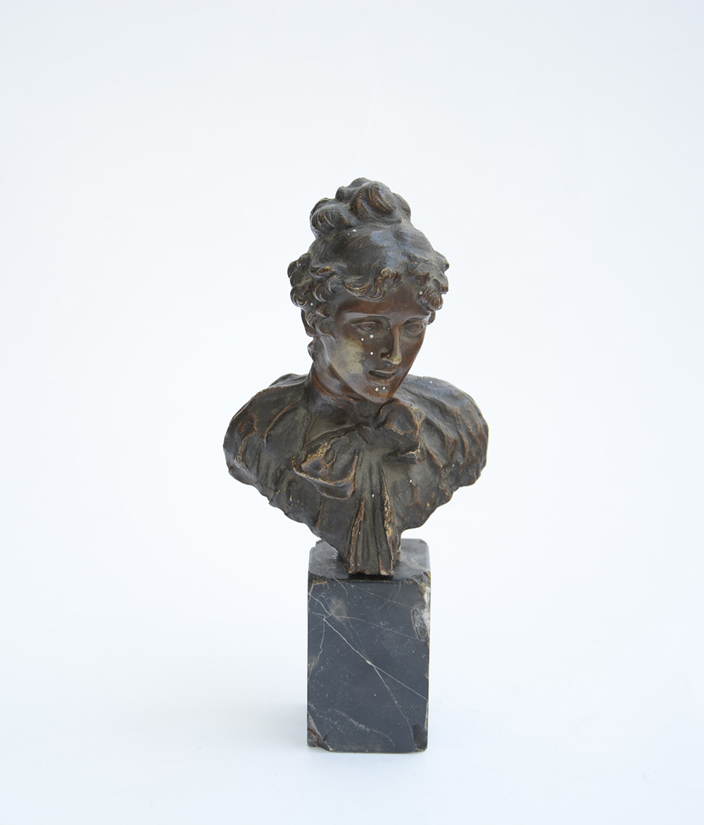Giovanni Battista Amendola (Episcopio di Sarno 1848 - Napoli 1887) "Mezzobusto di donna" scultura in bronzo (h cm 18) poggiante su base in marmo. AL retro: firmata e timbro Art Napoli (difetti)