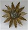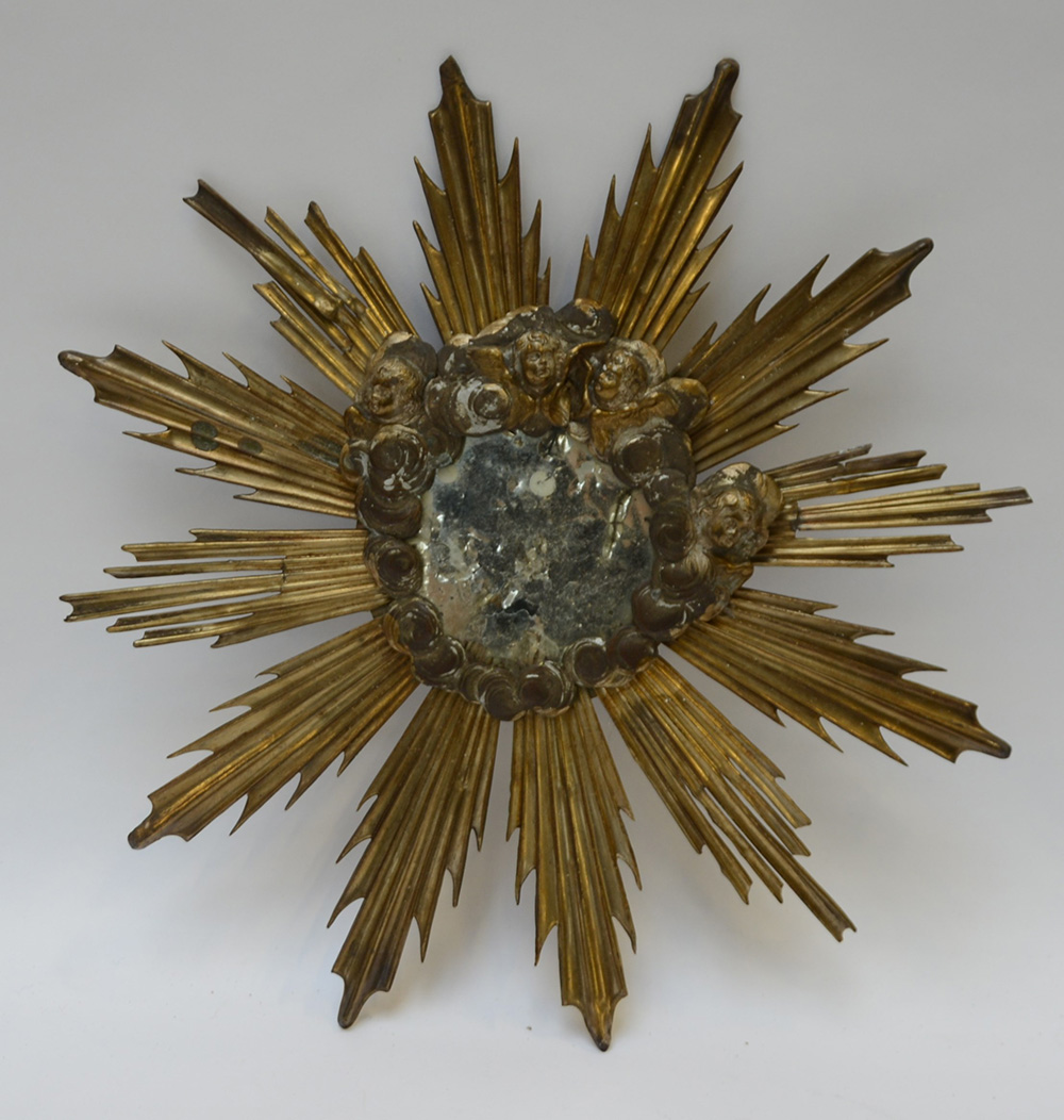 Arte del sec. XIX. Specchio in ottone e rame sbalzato decorato a putti, nuvole e raggi stilizzati (cm 46.5) (difetti)