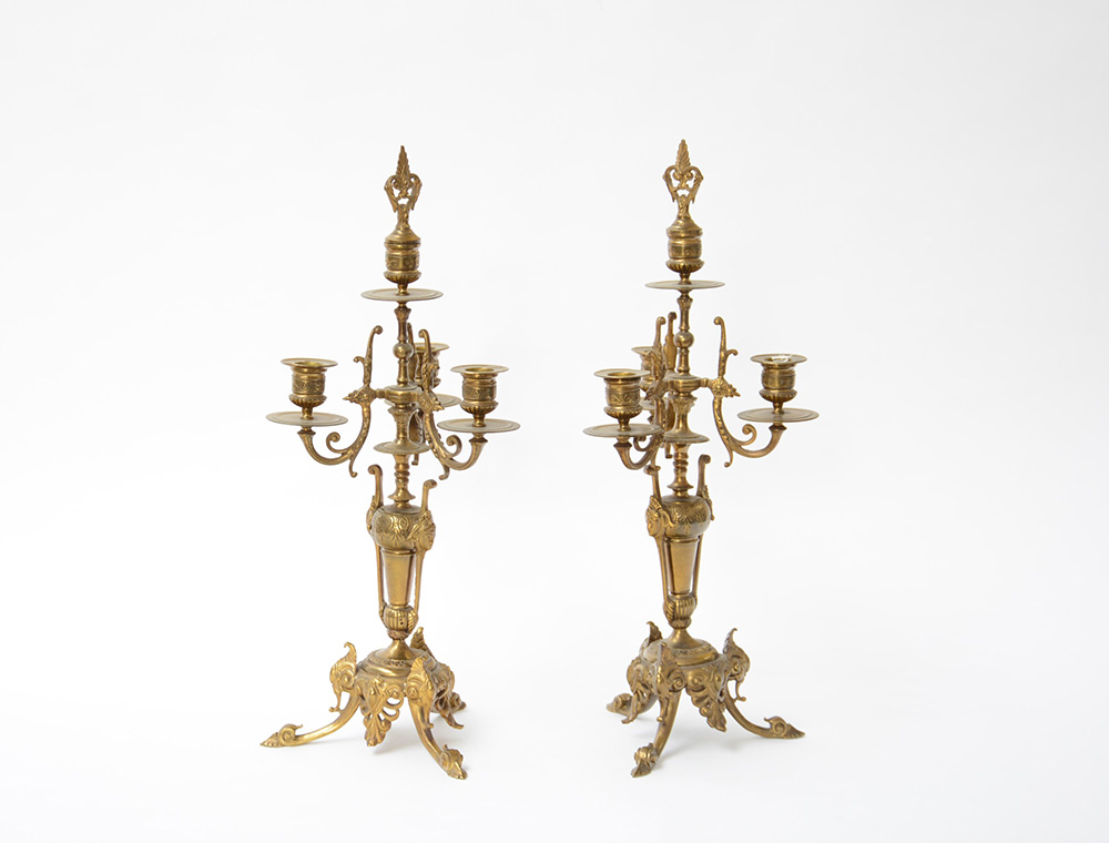 Coppia di candelieri in bronzo a quattro fiamme decorati con fregi in rilievo (h cm 40)