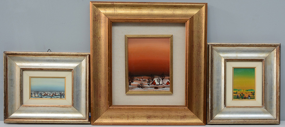 Firma indecifrata "Paesaggi". Lotto di tre dipinti naif di misure diverse, in cornice