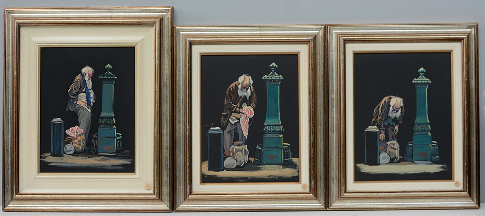 Luciano Dandolo "Il Barbone" gruppo di tre tecniche miste su cartone, di misure diverse. Firmate e datate '83 in basso a destra. In cornice