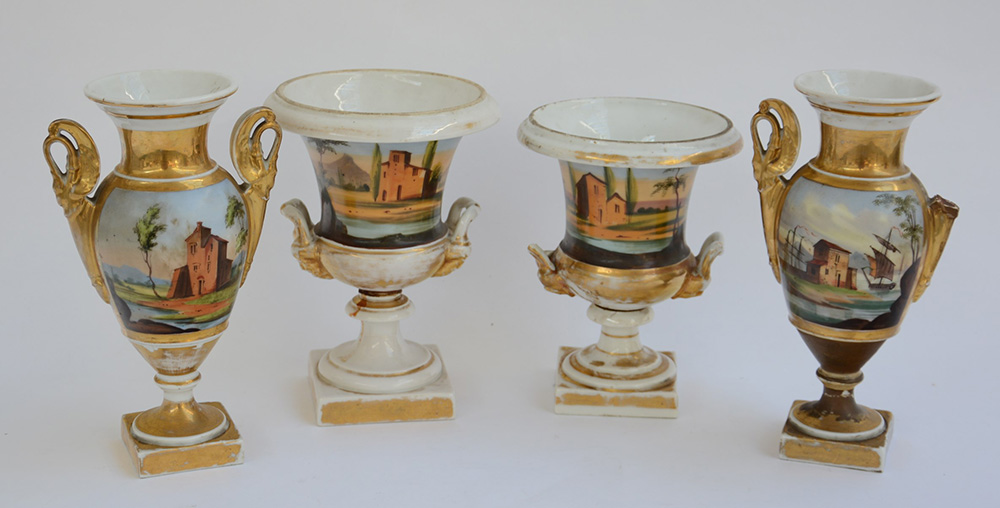 Lotto composto da due coppie di vasi in ceramica decorati a dorature e paesaggi (difetti e mancanze)