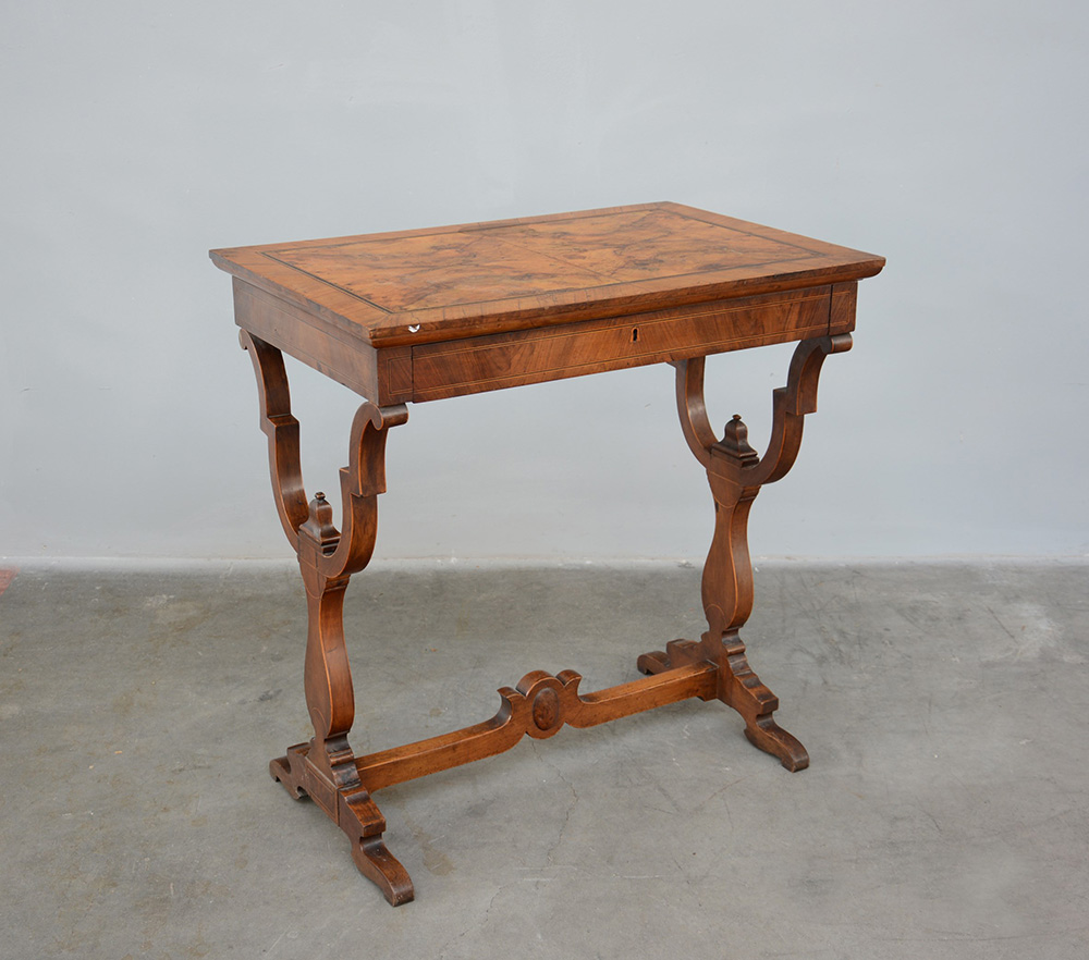 Tavolino da lavoro con cassetto, sostegni e traversa sagomati, piano radicato...