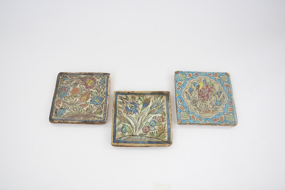 Lot 4136 | Tre piastrelle in stile Iznik smaltate con motivi floreali (20x20 cm. max)