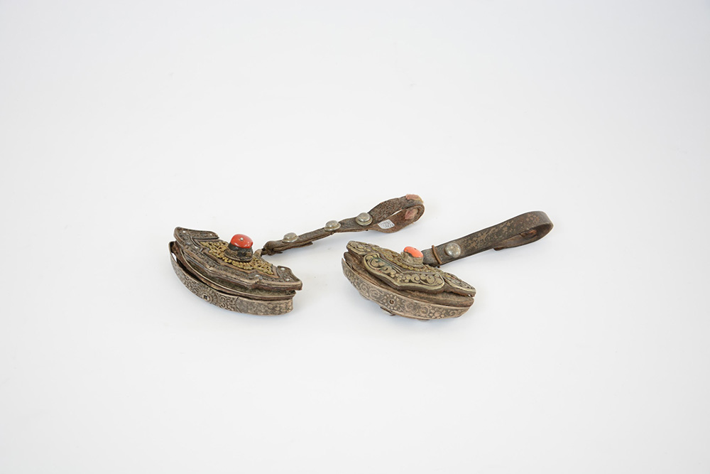 Due contenitori in metallo lavorato e cuoio con inserti in pietre...