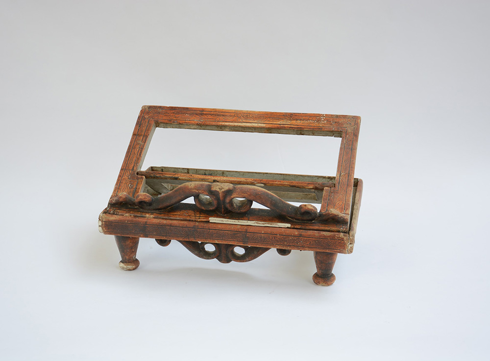 Leggio fine sec. XIX in legno bulinato e decorato a fregio traforato (difetti)