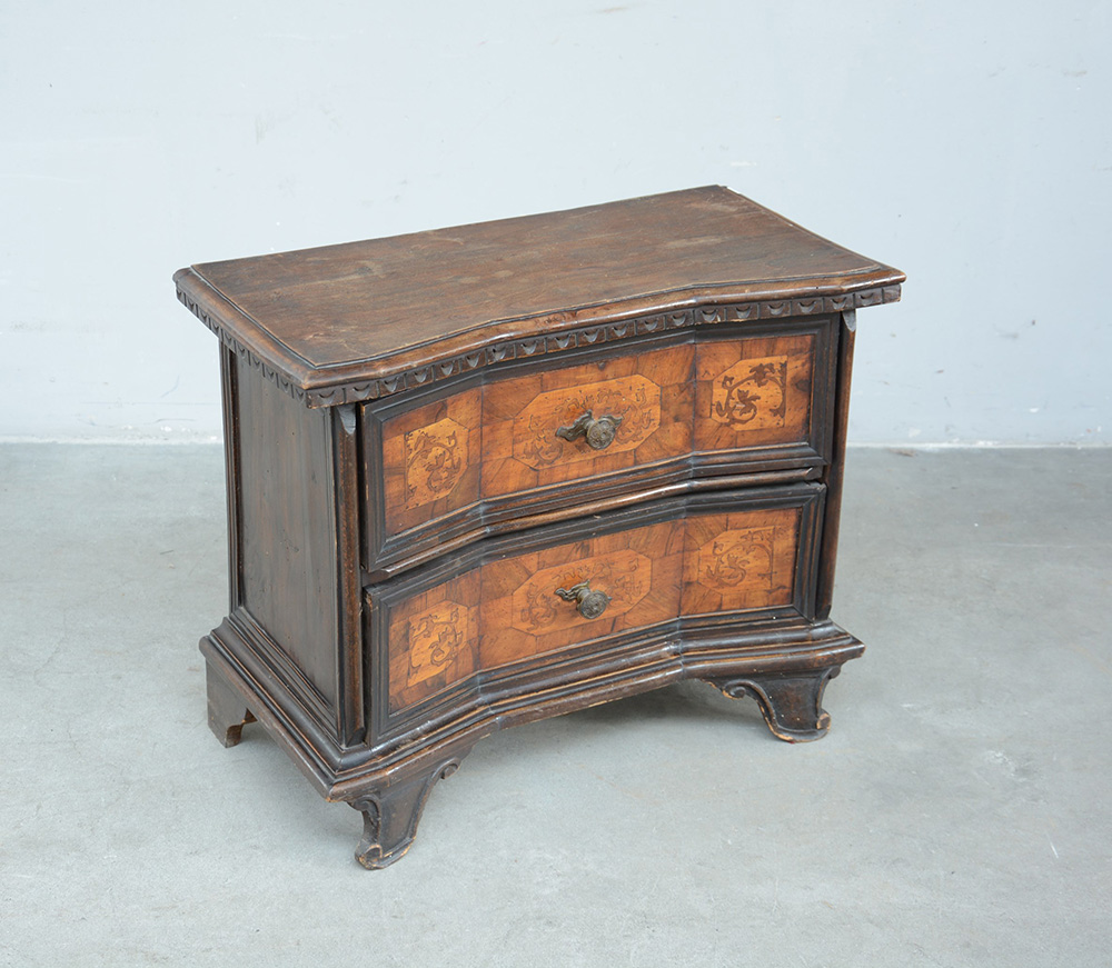 Mobiletto rinascimentale di forma sagomata a due cassetti intarsiati (cm 70x56x33)