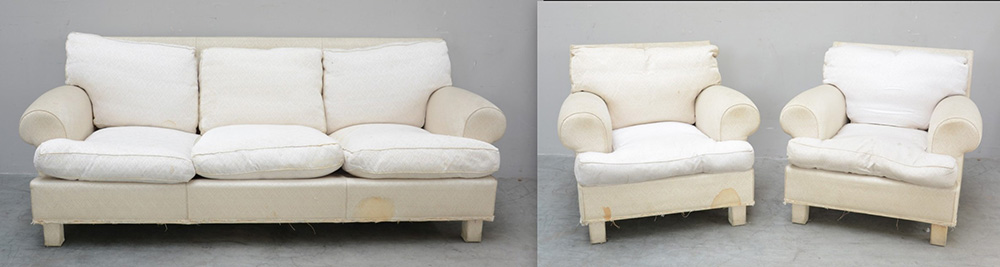 Fornitura da salotto composto da divano e due poltrone con piedi squadrati (difetti)