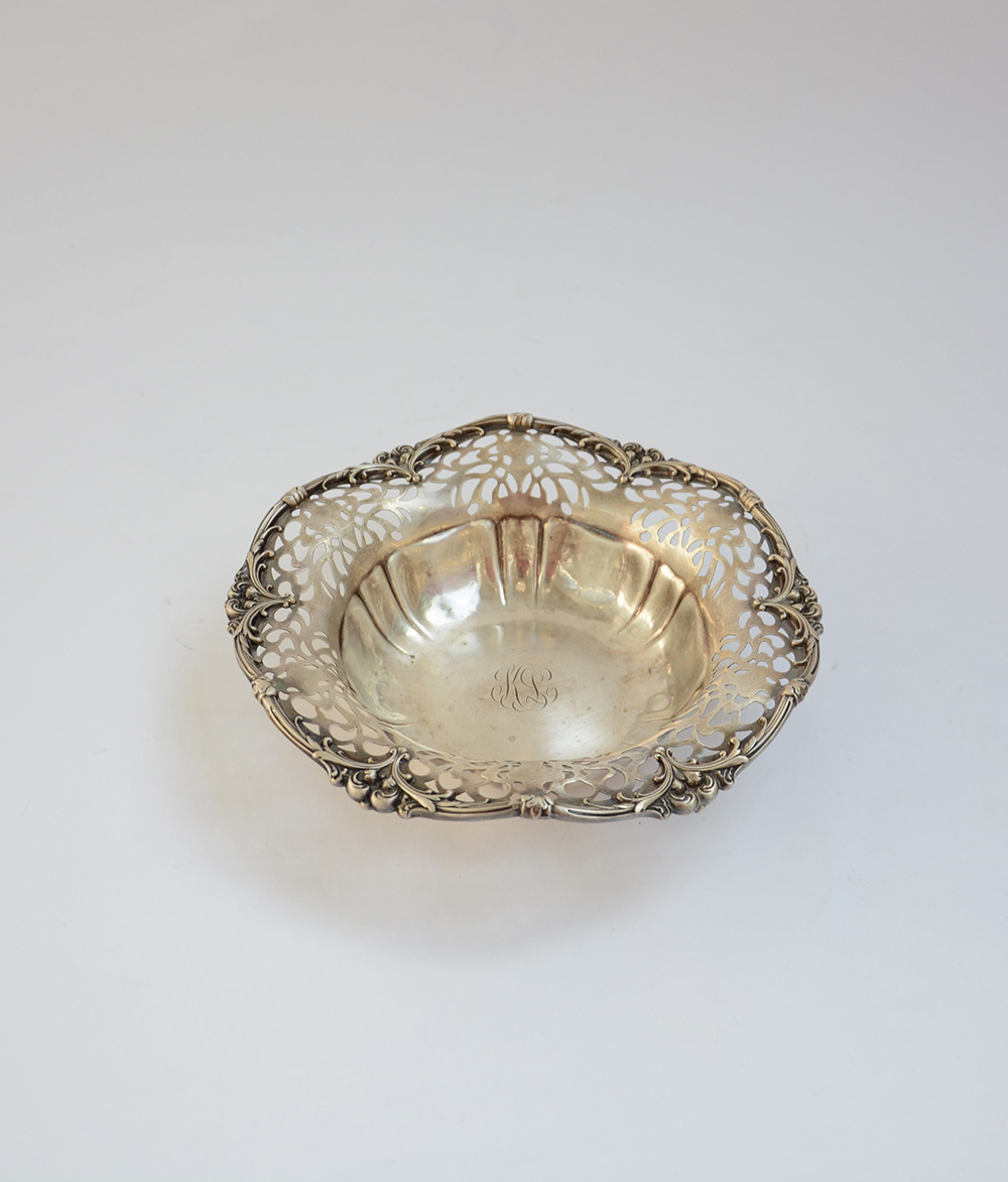 Centrotavola in argento di forma circolare con tesa sagomata e traforata. Stati Uniti, sec. XX (d. cm 23) (gr 260 ca.) (difetti)