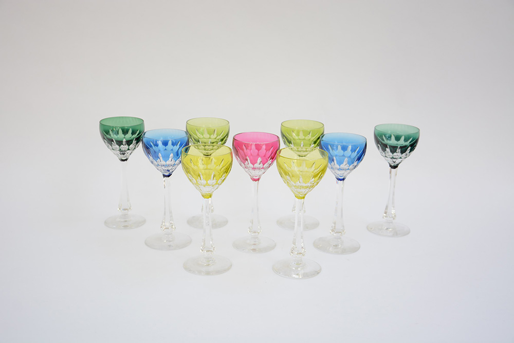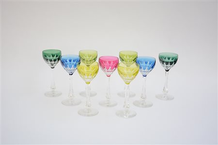 Manifattura di Boemia. Gruppo di nove bicchieri in cristallo colorato
