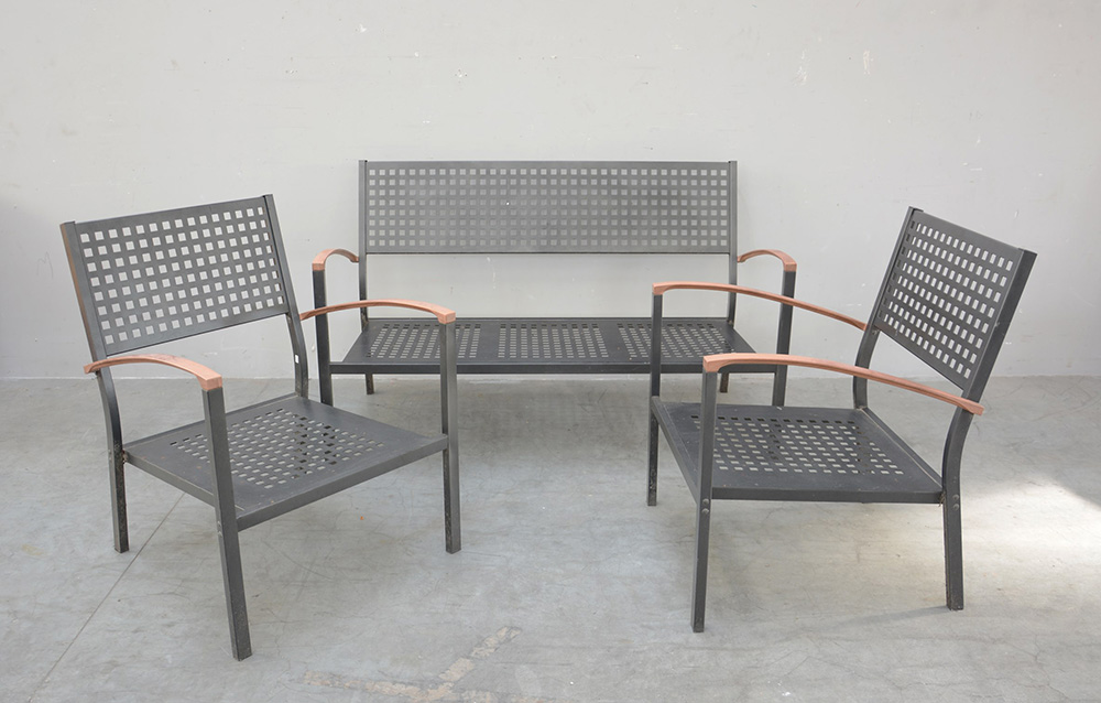 Fornitura da giardino composta da due poltrone e un divanetto in ferro e legno (difetti)