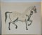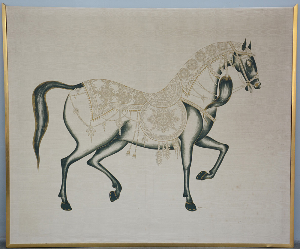 Pannello in seta dipinto con figura di cavallo con bardature (cm 128x150) firmato Fabbrisan. In cornice (difetti)