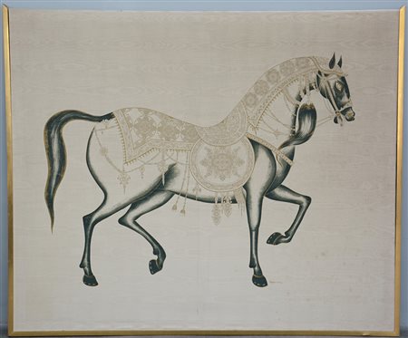 Pannello in seta dipinto con figura di cavallo con bardature (cm 128x150)...