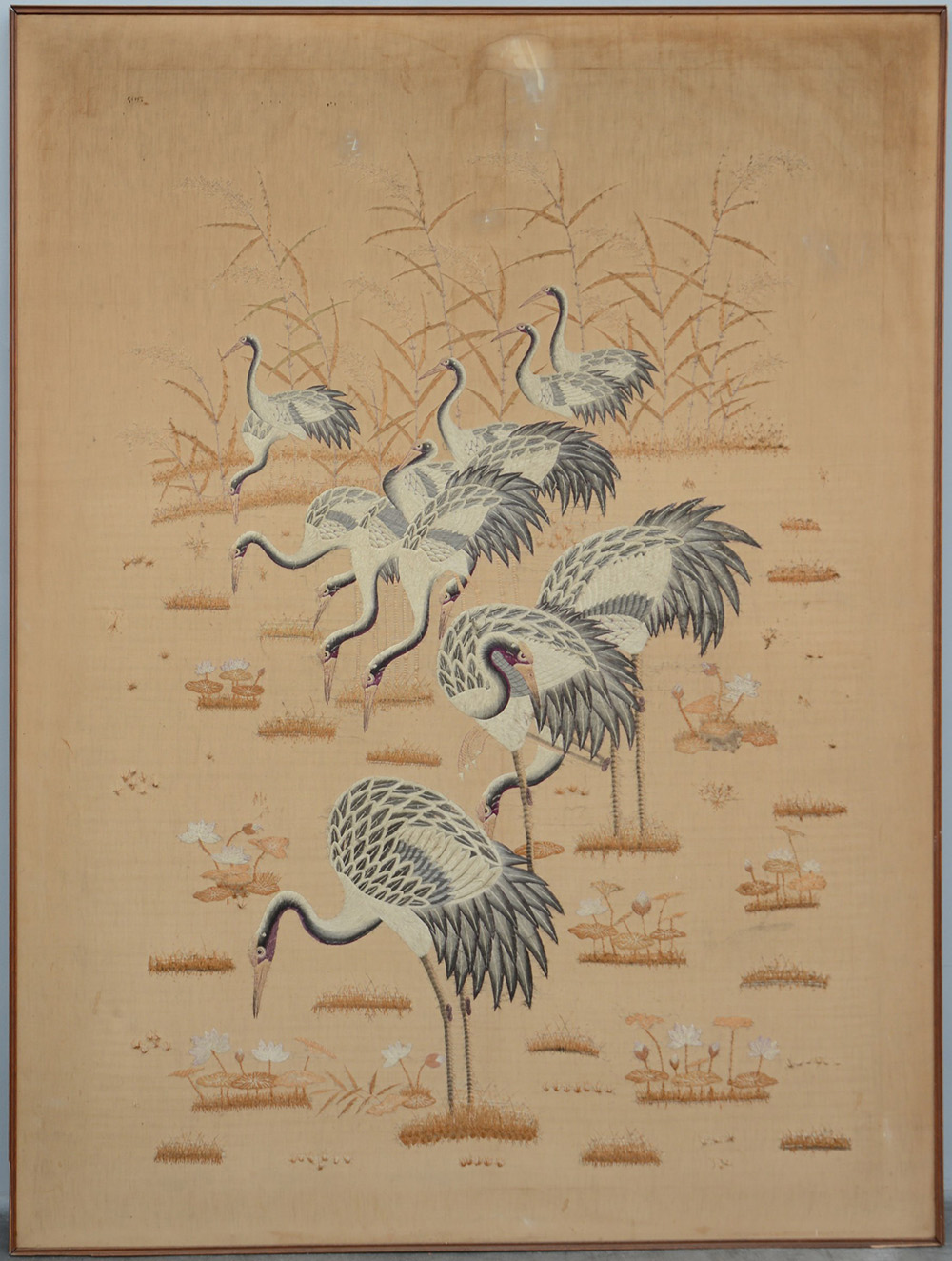 Pannello in seta ricamato con gru in laghetto con fiori di loto, in cornice (difetti) Giappone, sec. XX (179x134 cm.)
