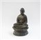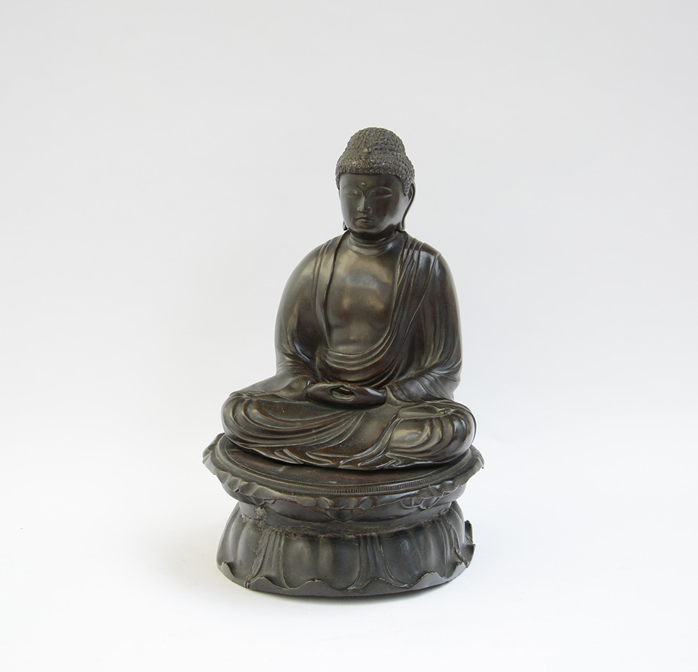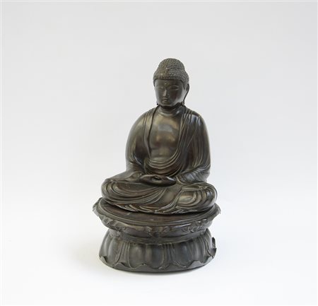 Buddha in metallo raffigurato seduto su base, iscrizione calligrafica (difetti) Giappone, sec. XX (h. 41 cm.)