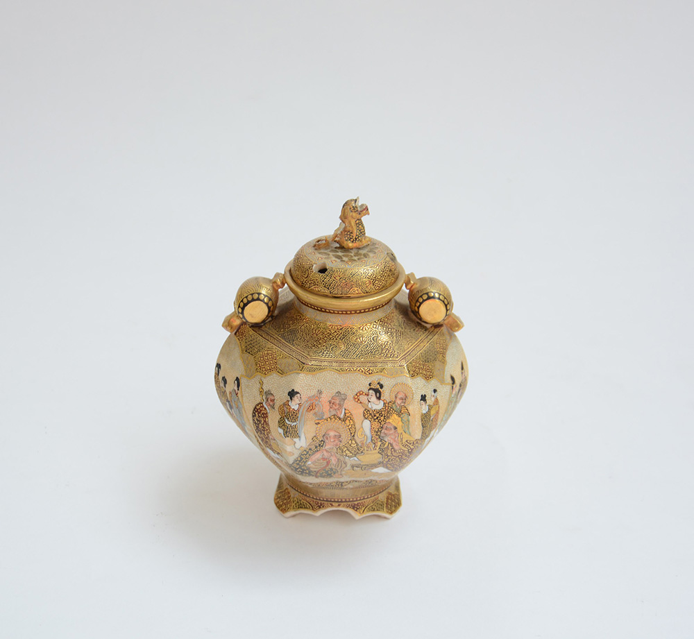 Incensiere con coperchio in porcellana Satsuma decorato con dorature e in...