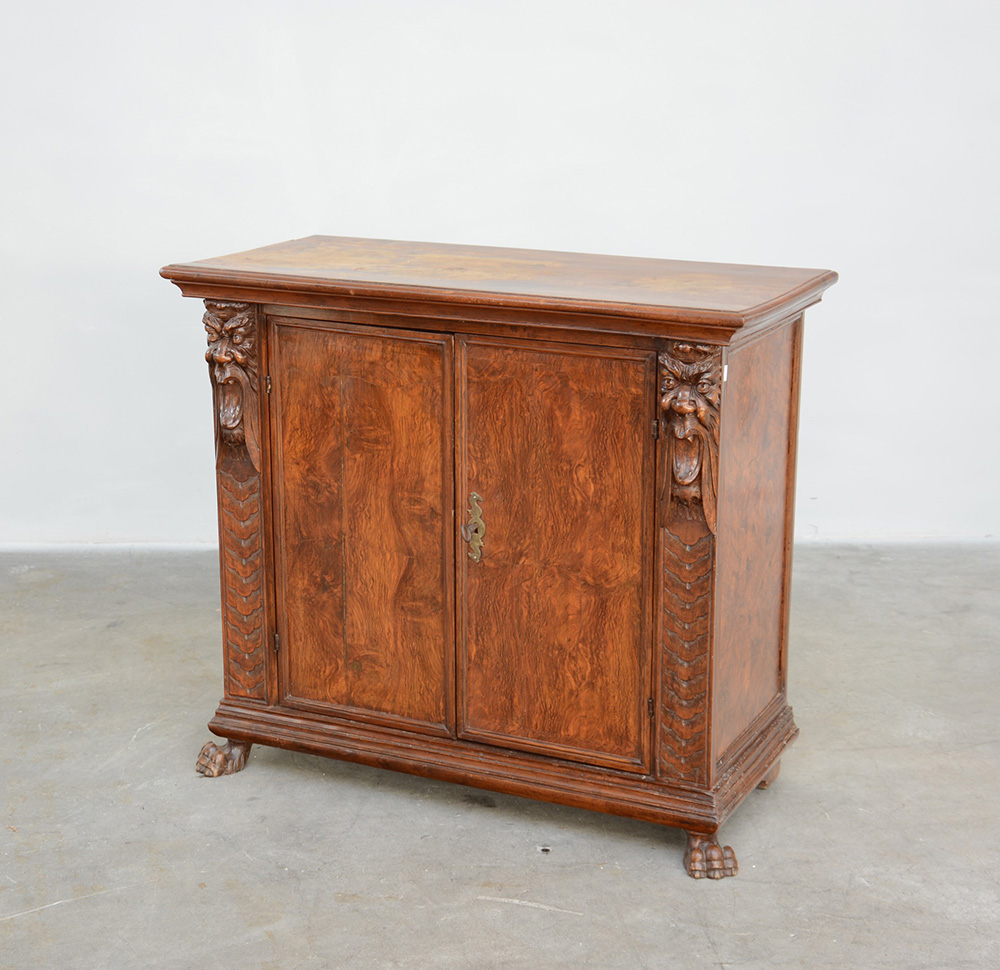 Credenza lastronata in noce a due ante sul fronte. Montanti scolpiti a mascheroni, piedi anteriori ferini (cm 96x85x46) (difetti)