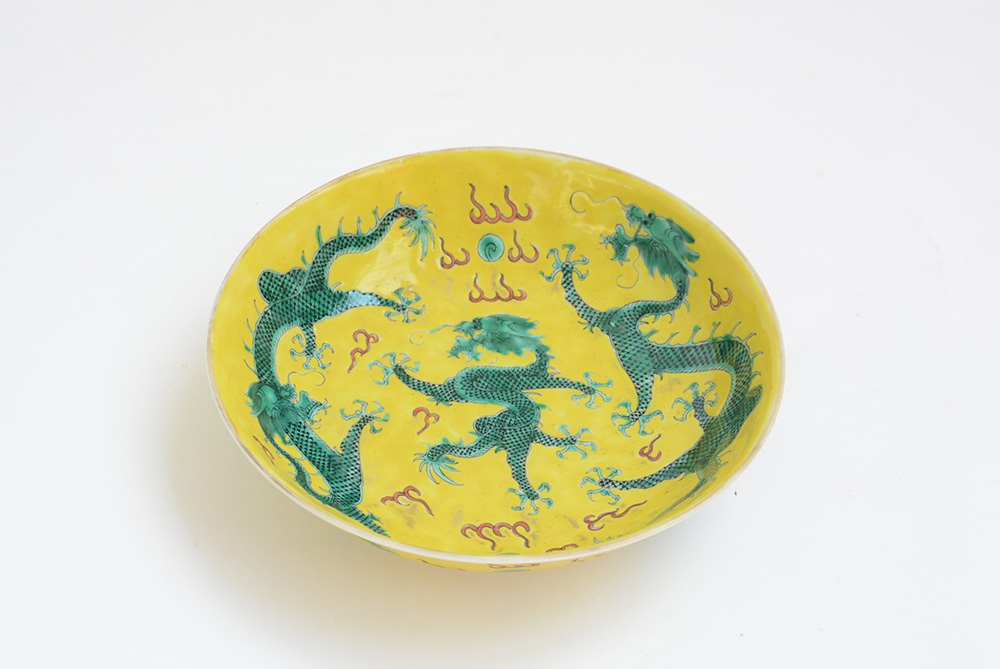 Piatto in porcellana con draghi verdi su fondo giallo, marchio Guangxu...
